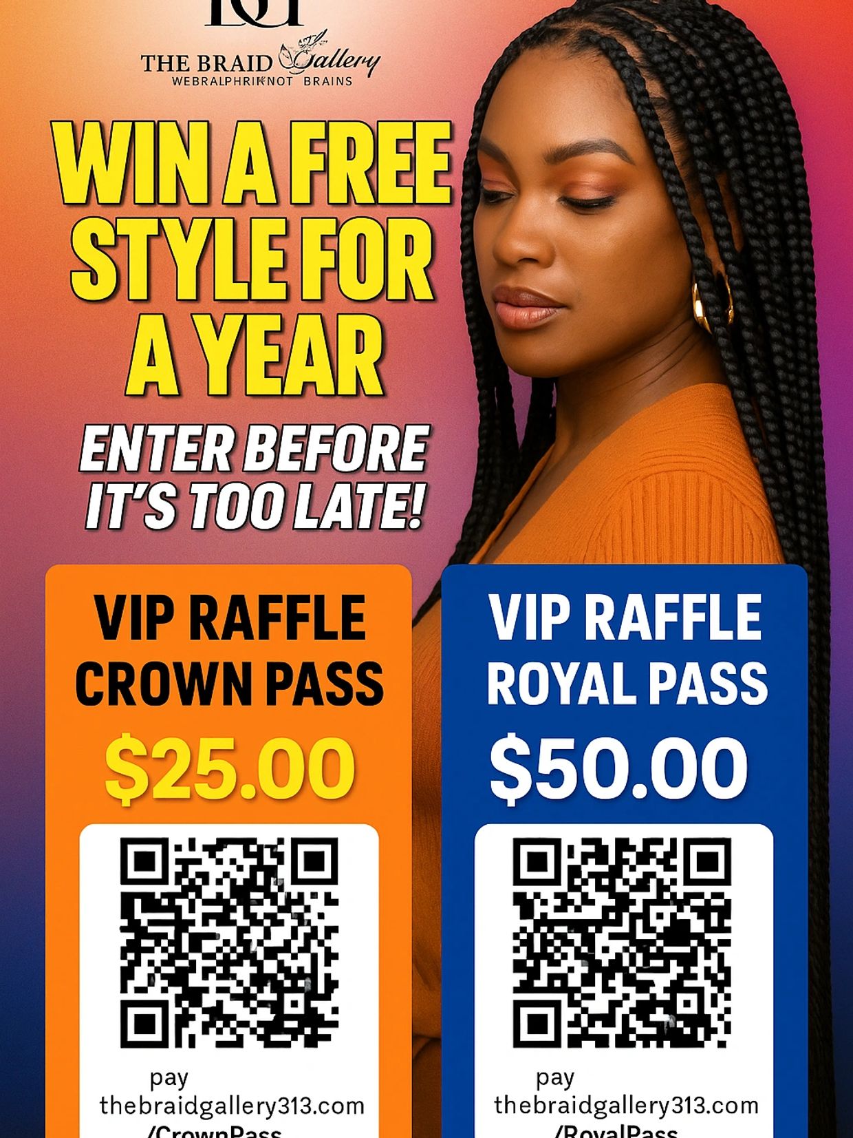 The Braid Gallery is excited to launch our VIP Client-Only Raffle, exclusively for our returning clients. This is your chance to win up to 1 year of FREE braid services — yes, you read that right. Four lucky winners will be crowned, but only if you enter before the deadline!